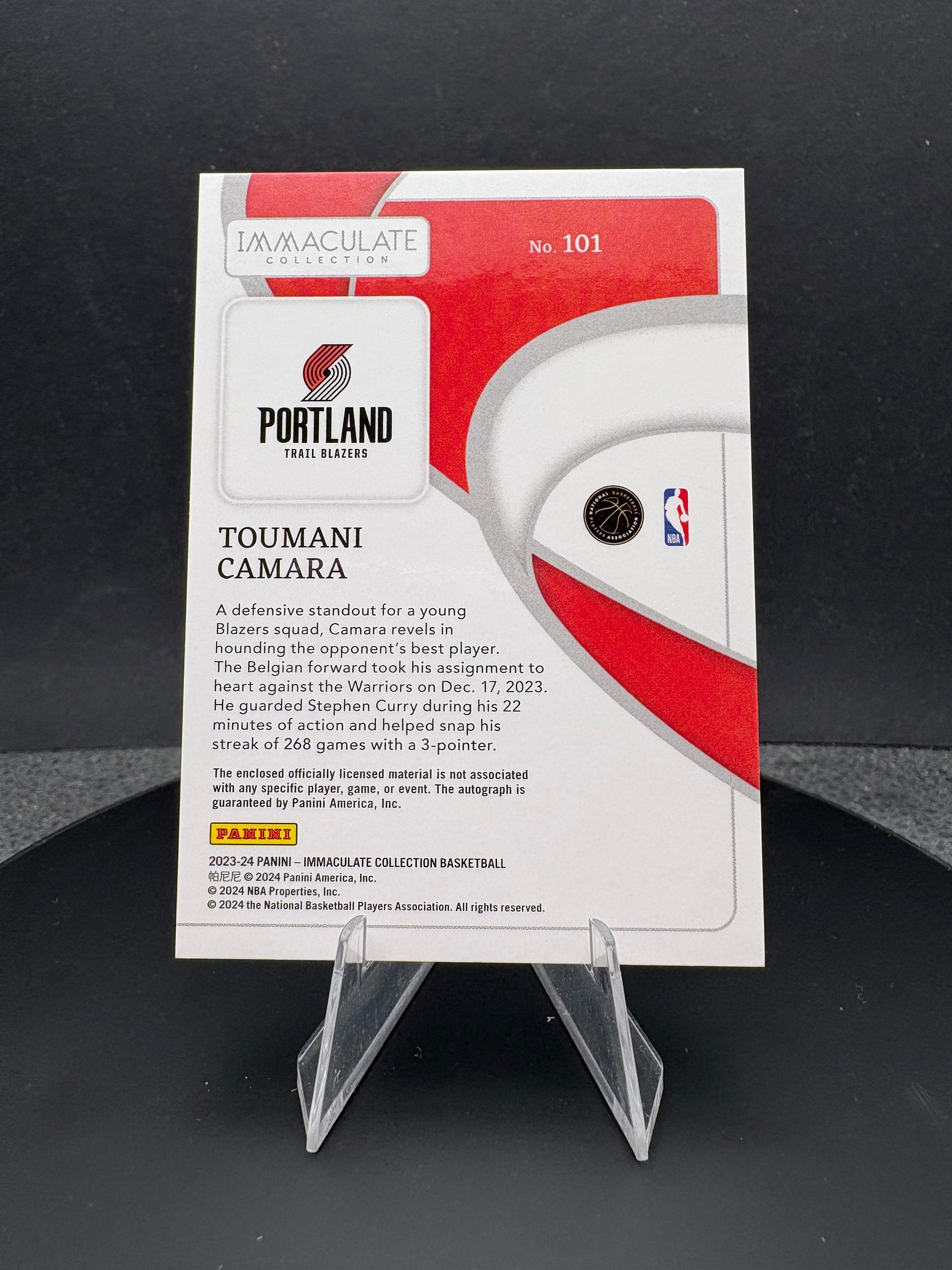 The 2023-24 Toumani Camara Immaculate Collection /99 features a rare rookie card showcasing an exclusive two-color patch and an autograph, limited to just 99 copies. This high-end collectible highlights Camara’s early career promise with premium materials and impeccable craftsmanship, making it a standout addition for serious basketball card enthusiasts and investors seeking unique, low-print assets.