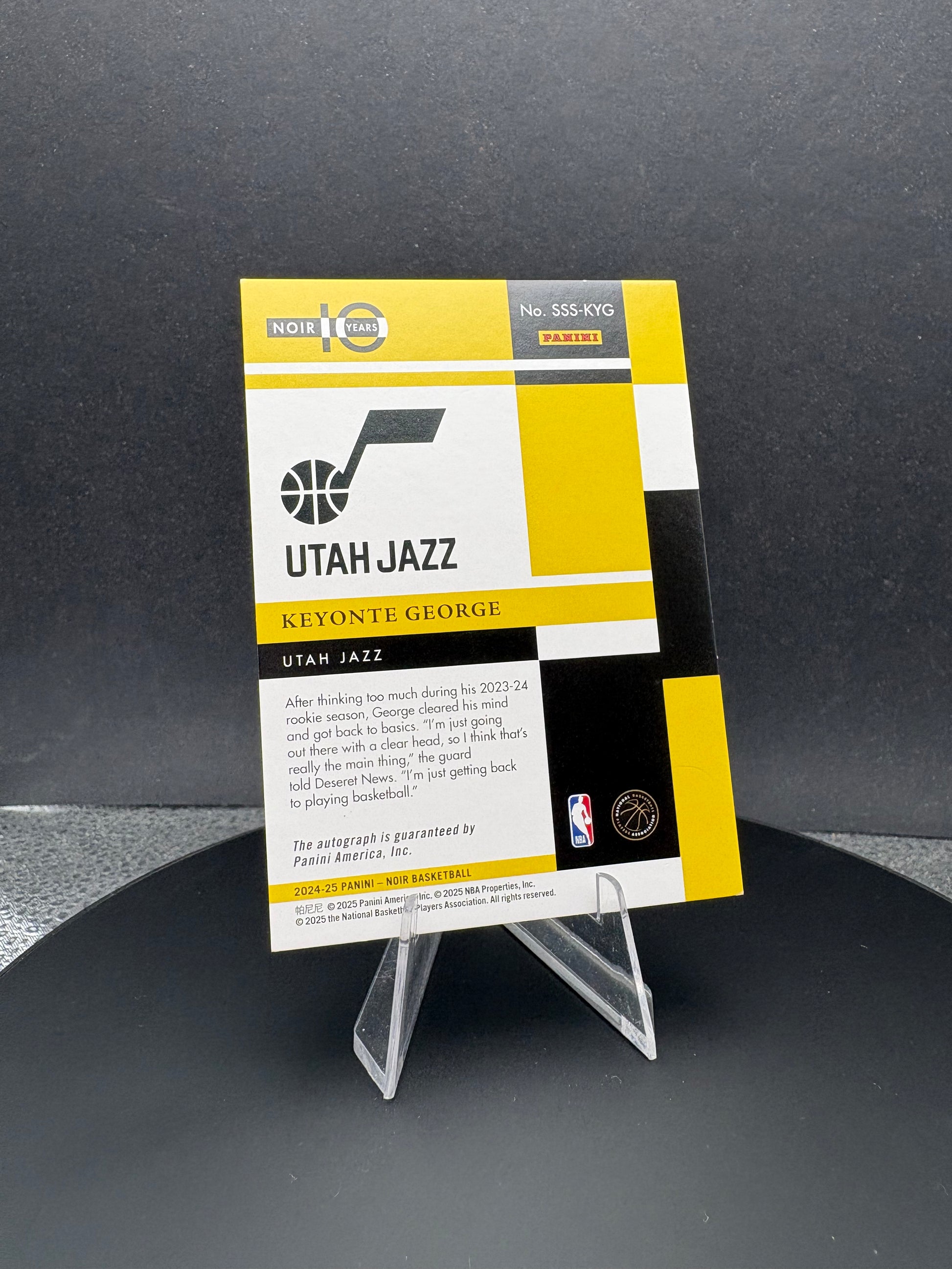 Keyonte George's signature sneaker takes center stage in this exclusive 2024-25 NOIR Sneaker Spotlight edition. Limited to just 99 numbered copies, each card features an authentic autograph capturing a pivotal moment from George's breakout season. Perfect for collectors seeking premium basketball memorabilia with verified authenticity and scarcity. A must-have for serious enthusiasts of modern NBA talent and high-end sports cards.