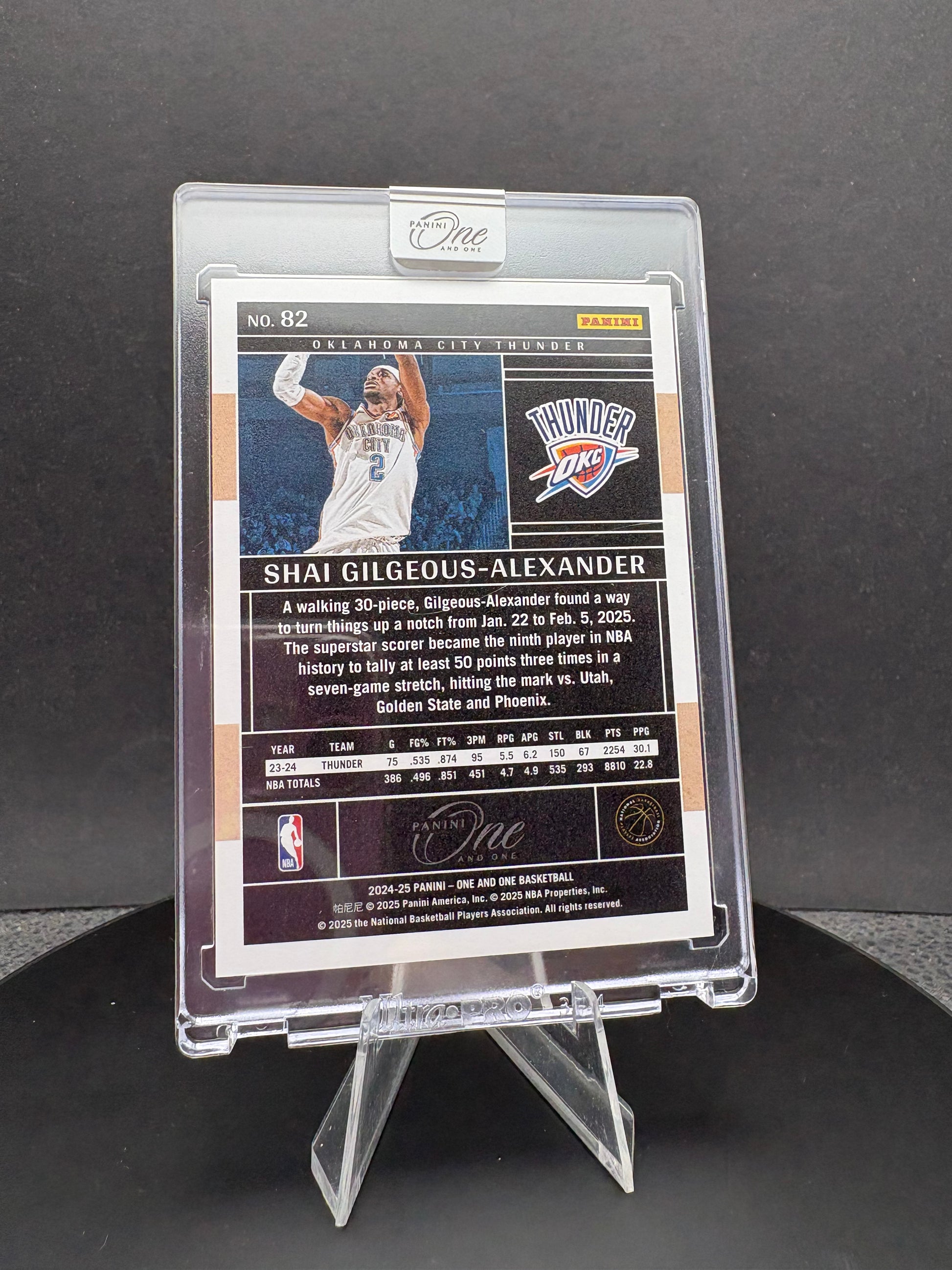 2024-25 One and One Shai Gilgeous-Alexander card limited to just 75 copies. This premium trading card captures the Oklahoma City Thunder star in his prime, featuring the distinctive One and One design aesthetic. A highly sought-after collectible for SGA enthusiasts and serious card investors. Low print run ensures scarcity and long-term value potential. Perfect for display or portfolio building.