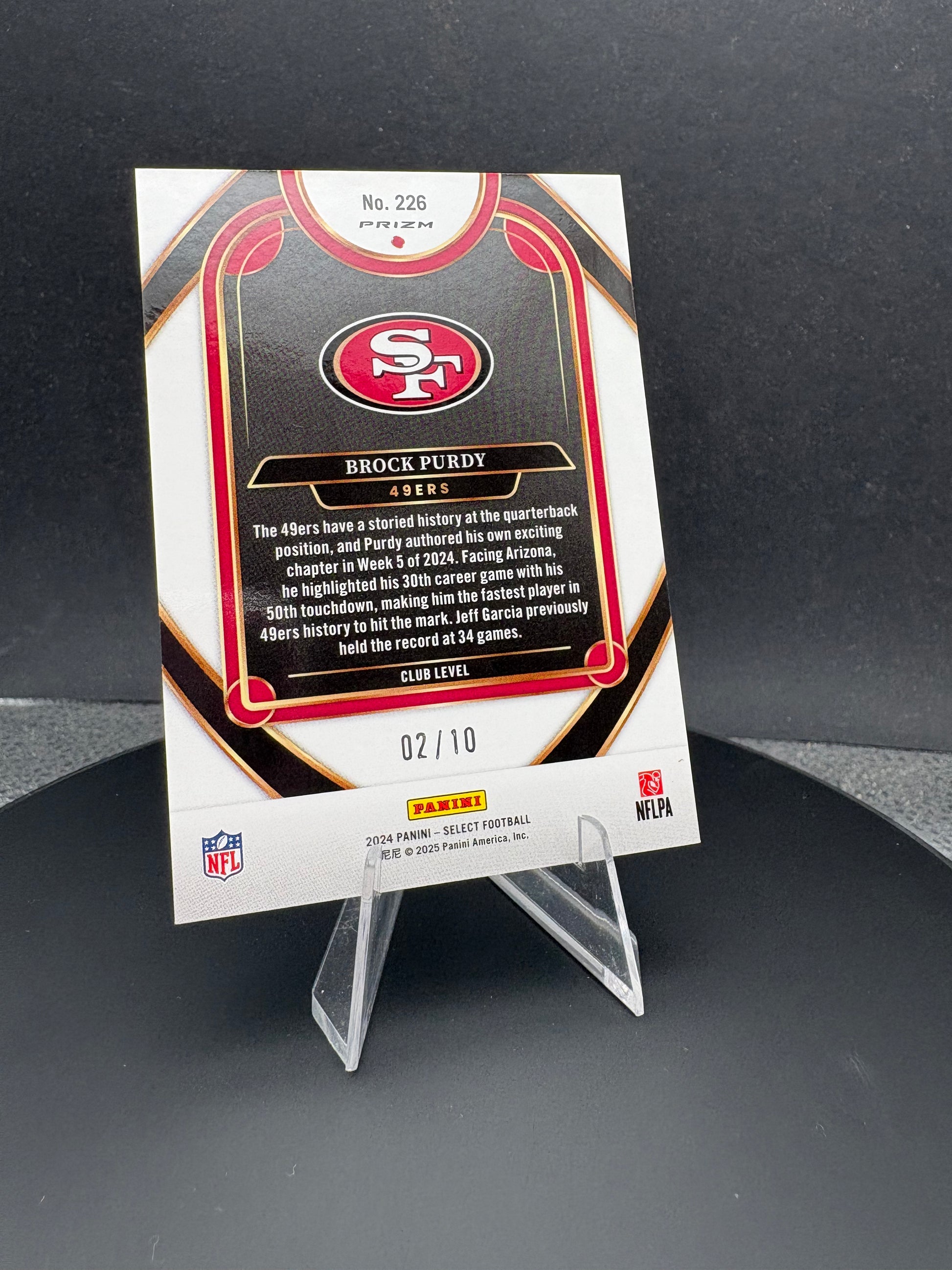 2024 Select Brock Purdy Shock Prizm /10 Red and Yellow This limited-edition trading card features San Francisco 49ers quarterback Brock Purdy in the premium Select Shock Prizm line. Numbered to just 10 copies, this red and yellow variant showcases the distinctive prismatic technology that Select is known for, creating dynamic visual effects as light hits the card. A must-have for serious Purdy collectors and 49ers fans seeking high-end, low-print-run memorabilia from the 2024 season.