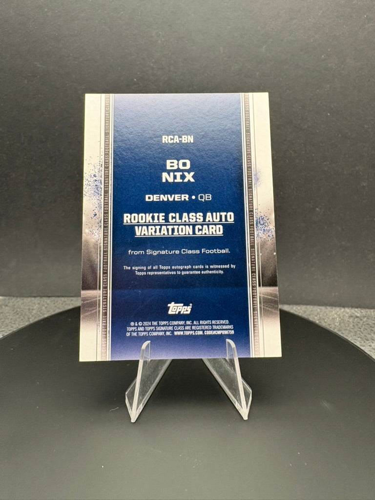 The 2024 Topps Rookie Class AUTO variation featuring Bo Nix is a highly sought-after collectible for serious sports card enthusiasts. This card showcases an autographed rookie version of Nix, highlighting his entry into the professional arena with a unique variation that distinguishes it from the base rookie card. Ideal for collectors focusing on emerging talent, this card combines authenticity with potential future value in the football card market.